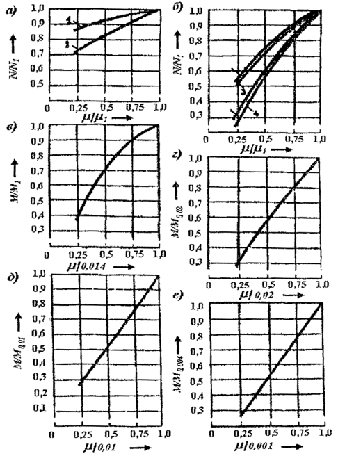 11.2. Снижение прочности нормальных сечений при уменьшении количества продольной арматуры: а - центрально сжатых элементе; б - внецентренно сжатых элементов; в - балок перекрытии; г - балок покрытий; д - ребристых плит покрытий; е - многопустотных плит перекрытий; 1 - при m1=1%; 2 - при m1=3%; 3 - при m1=0,5%; и eo=ho; 4 - при m1=0,5% и eo=2ho; 5 - при m1=1,5% и eo=ho; 6 - при m1=1,5% и eo=2ho