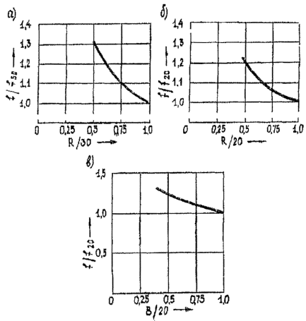 11.8. Увеличение прогибов при уменьшении прочности бетона: а - балок покрытии; б - ребристых плит покрытий; в - многопустотных плит перекрытий