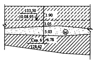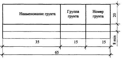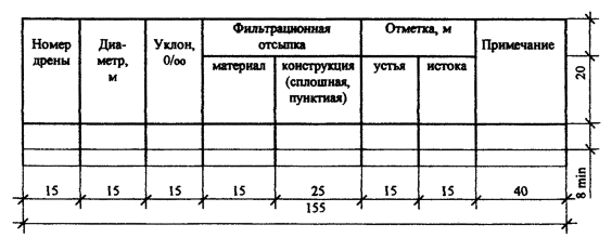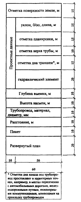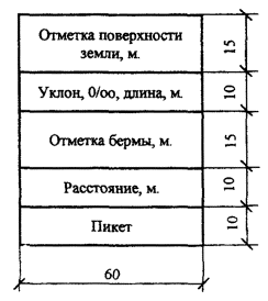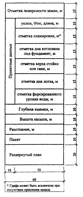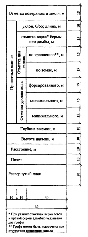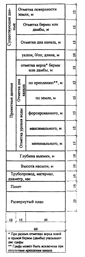 5.1.5. Буквенно-цифровые обозначения каналов на плане указывают на полках линии-выноски. Буквенно-цифровые обозначения дрен и диаметры дрен на плане указывают в разрывах их графического обозначения. 5.1.6. За нулевой пикет линейного сооружения оросительной сети принимают: для магистрального канала - начало водовыпускного сооружения напорного трубопровода насосной станции или пересечение оси канала с осью закладной детали нижнего уплотнения рабочего затвора головного сооружения (узла); - для каналов второго и последующих порядков - пересечение оси канала с осью канала высшего порядка. За нулевой пикет линейного сооружения осушительной сети принимают: - точку пересечения оси канала (коллектора) низшего порядка с осью канала (коллектора) высшего порядка - водоприемника; - точку, закрепленную геодезическими координатами у уреза воды. 5.1.7. На планах линейных сооружений условные обозначения узлов и их элементов показывают на выносных линиях, располагаемых в сторону движения воды в канале (трубопроводе). Размеры обозначений должны быть одинаковыми на чертежах, выполняемых в одном масштабе. 5.2. Продольные профили линейного сооружения 5.2.1. На продольном профиле показывают: - линию фактической поверхности земли; - проектную линию дна канала (открытого коллектора), дна основания и верха закрытого коллектора, бермы или дамбы; - линии ординат от точек переломов фактической поверхности земли и точек сопряжения элементов проектной линии продольного профиля; - геодезические знаки (реперы, пункты геодезических сетей местного значения), определяющие исходные высоты; - существующие и проектируемые наземные, надземные и подземные инженерные коммуникации с указанием пикетных значений мест пересечения на ординатах профиля; - пикеты принимаются через 100 м. Другие данные указывают с учетом специальных требований к сооружениям. Пример оформления продольного профиля канала приведен в приложении Д. 5.2.2. Перечень вышеуказанных данных приводят в таблице (сетке), помещаемой под продольным профилем. В зависимости от назначения линейного сооружения боковик таблицы выполняют: - для вновь проектируемых каналов оросительной сети - по форме 5; - для реконструируемых каналов оросительной сети - по форме 6; - для вновь проектируемых каналов осушительной сети - по форме 7; - для реконструируемых каналов осушительной сети - по форме 8; - для каналов в лотках - по форме 9; - для трубопроводов (водоводов) - по форме 10. При использовании ЭВМ для построения продольного профиля допускается применять другие формы боковиков, удобные для автоматизированного проектирования, а разведочные геологические выработки допускается приводить на профилях в виде таблицы, выполняемой по форме 4. Форма 4 В таблице указывают: - в графе «Группа грунта» - номер группы грунта в соответствии с классификацией по трудности их разработки; - в графе «Номер грунта» - условный номер, принятый для обозначения грунта. В этом случае на профиле указывают условный номер грунта в кружке, диаметром 5 - 7 мм. 5.2.3 Геологические и гидрогеологические разрезы показывают на продольных профилях магистральных, распределительных каналов (главных коллекторов) на глубину до 5 м от дна канала (основания трубопроводов). В отдельных случаях, в зависимости от геологических условий, допускается показывать разрезы на больш