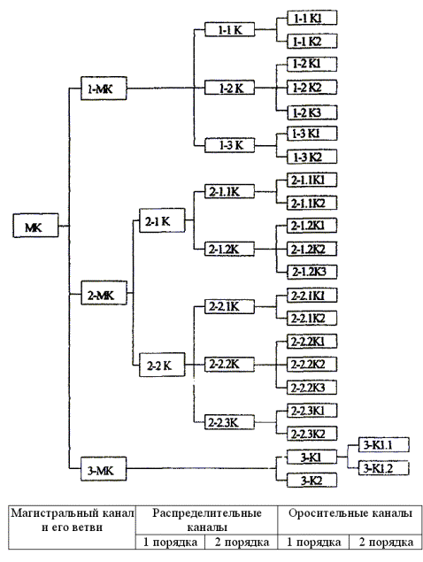 3.14. Ветви магистрального канала (главного коллектора) и распределительные каналы различного порядка оросительной (осушительной) системы обозначают порядковыми номерами в пределах соответствующей системы, которые указывают перед буквенным обозначением линейного сооружения. Пример - 1-МК; 2-МК или 1-ГД; 2-ГД. Нумерацию ветвей магистрального канала (главного коллектора) начинают от водоисточника (водоприемника) и продолжают в направлении движения воды - для оросительной сети, против движения воды - для осушительной сети. Каналы оросительной сети (каналы регулирующие осушительной сети) обозначают порядковыми номерами, которые проставляют после буквенного обозначения распределительного или подводящего канала. Пример - К1; К2 или Д1; Д2. Порядковые номера распределительных каналов (оросительные сети) или коллекторов (осушительные сети) одного порядка отделяют от соответствующих каналов другого порядка точкой. Пример - K1.1; K1.2 или Д1.1; Д1.2. Пример обозначения каналов оросительной системы приведен в приложении Г. 4. ОБЩИЕ ДАННЫЕ ПО РАБОЧИМ ЧЕРТЕЖАМ4.1. В состав общих данных по рабочим чертежам в дополнение к данным, предусмотренным ГОСТ 21.101, включают: - ситуационный план мелиоративных сетей (при необходимости); - экспликацию линейных сооружений по форме 1; Форма 1