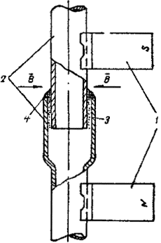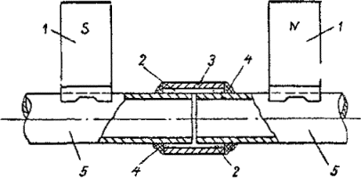 1. ОБЩИЕ ПОЛОЖЕНИЯ1.1. Настоящая инструкция распространяется на монтаж систем отопления с применением черных стальных труб во вновь строящихся и реконструируемых жилых, общественных и промышленных зданиях, 1.2. Сущность способа магнитной пайки состоит в том, что в течение всего процесса пайки металлокерамический припой, содержащий расплавляемую и нерасплавляемую (ферромагнитный наполнитель) фазы, удерживается и равномерно распределяется в зазоре между соединяемыми элементами под действием сил магнитного поля, создаваемого постоянными магнитами. При магнитной пайке (рис. 1) переносные постоянные магниты 1 устанавливаются на подготовленные для пайки трубы 2 по обе стороны от стыка. Зазор между трубами заполняется порошком железа, поверх которого наносится припой. Вводимые в зазор частицы железного порошка 3 под действием магнитного поля (напряженностью В равной 100 мт (миллитесла) намагничиваются и заклинивают зазор, создавая "пробку" с мелкой сеткой капиллярных каналов. При нагревании пастообразный припой 4 плавится и пропитывает капиллярные каналы.