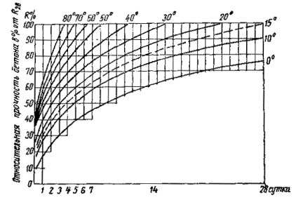 Рис. 2. График нарастания прочности бетона на портландцементе марок 400-500 Относительная прочность бетона на быстротвердеющем высокоактивном цементе в % от R28 (рис. 3)