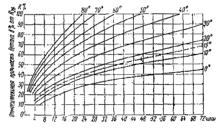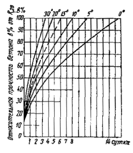 * Срок приобретения бетоном прочности 0,7 R28 25-30 дн. Примечания: 1. Хлористый кальций и его дозировка принимаются в зависимости от установленных сроков укладки асфальтобетонного покрытия. 2. При необходимости укладки асфальтового бетона ранее указанных сроков термосного выдерживания бетона или в ожидании понижения в последующем температуры воздуха ниже указанных в графе 2 следует применять искусственный прогрев бетона в конструкции (паро- или электропрогрев, прогрев горячим песком). 3. При учете коэффициента повышенной эффективности хлористого кальция при твердении бетона при низких положительных температурах приведенные в строках 5, 6, 7 сроки выдерживания могут быть снижены до 5 дней. Возможность этого должна быть подтверждена экспериментально для применяемого цемента. 4. Основой для оценки достигнутой прочности должны служить результаты измерения температур в конструкции и испытания контрольных образцов. В расчетах начальная температура бетона к концу укладки (строки 1-8) принята tбн = 15°. 5. В случае применения «холодного» бетона при понижении температуры воздуха ниже расчетной до истечения 30 дней с момента укладки усиливают (согласно теплотехническому расчету) утепление или осуществляют подогрев бетона электротоком посредством электродов, укладываемых поверх бетона в слое подкисленных опилок. 6. Применение «холодного» бетона допускается с ограничениями, предусмотренными СНиПом III-B.1-62, п. 6.29. 7. Для ускорения приобретения бетоном требуемой прочности допускается в опытном порядке применение электроразогрева бетонной смеси на объекте в специально оборудованных бункерах. 8. Для утепления бетона взамен опилок может применяться любой пригодный для этих целей материал с соответствующим пересчетом указанной толщины. Рекомендуются к применению маты стекловатные и минераловатные прошивные с оболочкой из бумаги l = 0,040-0,05. В расчетах принят коэффициент теплопроводности опилок l = 0,08 ккал/м×ч×град. Для шевелина l = 0,045; шлака котельного сухого l = 0,14-0,250; соломита l = 0,070; песка сухого l = 0,50-2,0. По теплопроводности опилкам толщиной слоя 1 см соответствуют: маты минераловатные и стекловатные прошивные - 0,57 см, шевелин - 0,40 см, шлак котельный - 23 см, песок сухой - 24 см. 9. При понижении минимальной суточной температуры до +5° должен осуществляться систематический контроль за режимом твердения бетона. Во всех случаях в журнале производства бетонных работ фиксируется температура бетона в конструкции к концу укладки. 10. При бетонировании в зимних условиях должен применяться гидрофобный портландцемент. В случае применения негидрофобного портландцемента следует вводить гидрофобизующую добавку при приготовлении бетонной смеси. 11. При теплотехнических расчетах следует учитывать в прогнозе не только температуру воздуха, но также и температуру на почве: она зимой и весной обычно на несколько градусов ниже среднесуточной. Приложение 2ГРАФИКИ РОСТА ПРОЧНОСТИ БЕТОНАОтносительная прочность бетона на портландцементе марок 400-500 в % к R28 (рис. 2)