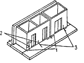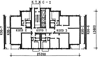 2. КОНСТРУКТИВНО-ПЛАНИРОВОЧНЫЕ РЕШЕНИЯ ДОМОВ2.1. Крупнопанельные жилые дома серии КОПЭ-85 состоят из компоновочных объемно-планировочных элементов (КОПЭ) и компоновочных элементов блокировки (КЭБ). КОПЭ представляет собой незамкнутую часть типовых секций, из которых компонуются каталожные типовые жилые секции (КТЖС); из секций с помощью компоновочных элементов блокировки (КЭБ) образуются 22-этажные жилые дома различной протяженности и конфигурации в плане. Типовые проекты 22-этажных жилых крупнопанельных домов серии КОПЭ-85 разработаны Управлением Моспроект-1 на основе объемно-планировочных элементов из изделий территориального каталога ТК-Г, предназначенных для массового строительства в Москве, осуществляемого ДСК-2 ПСО Главмосстрой. 2.2. В типовых проектах разработаны рядовые и поворотные КОПЭ с жилыми первыми этажами. Сочетание различных КОПЭ дает возможность получить 4 варианта секций: КТЖС-1, КТЖС-2, КТЖС-5 и КТЖС-9. Для КТЖС-1, 2, 5 и 9 разработана номенклатура предприятий обслуживания населения для размещения их при привязке в первых нежилых этажах высотой 2,8 м. Каждая типовая жилая секция состоит из трех КОПЭ: лестнично-лифтового КОПЭ-1 и двух жилых КОПЭ с набором одно-, двух-, трех- и четырехкомнатных квартир, расположенных в левой и правой частях секции. В жилых КОПЭ находятся по две квартиры (рис. 1). Высота этажей - 2,8 м. В домах предусмотрено современное инженерное оборудование, лифты и мусоропроводы. Основные объемно-планировочные показатели КТЖС-1, 2, 5 и 9 приведены в табл. 1. 2.3. Конструктивная схема домов - несущие внутренние продольные и поперечные стены. Шаг поперечных стен - 3,6 м. Наружные стеновые панели - навесные. Панели перекрытий опираются на панели внутренних стен. 2.4. Подземная часть домов запроектирована с применением следующих конструкций: Рис. 1. Типовая жилая секция КТЖС-1 (КОПЭ-2, КОПЭ-1, КОПЭ-3) - фундаменты - свайные и монолитная железобетонная плита; - внутренние несущие стены - из сборных бетонных панелей толщиной 180 и 220 мм; - наружные стены цоколя - железобетонные трехслойные панели толщиной 250 и 280 мм; - перекрытие - железобетонные плоские панели, размером "на комнату"; - входы в техническое подполье, крыльца и др. - сборные железобетонные элементы. 2.5. Надземная часть жилых домов решена с применением следующих конструкций: - наружные стены - навесные трехслойные железобетонные панели на гибких связях с утеплителем из пенопласта. Общая толщина навесных панелей 350 мм (с учетом 100 мм ребер по контуру) и 280 мм (в торцевых стенах); - внутренние несущие стены - бетонные плоские, размерами "на комнату", толщиной 220, 180 и 140 мм; - панели перекрытий - сплошные плоские железобетонные, размером "на комнату", толщиной 140 мм с каналами для электропроводки; - лестницы - из сборных железобетонных маршей и площадок толщиной 200 мм; - перегородки - железобетонные толщиной 80 мм; - шахты лифтов - из объемных железобетонных элементов высотой на этаж, с постоянными дверями в закрытом положении; - санитарные узлы - из полностью отделанных и оборудованных на заводе унифицированных объемных кабин; - блоки инженерных коммуникаций - гипсобетонные высотой на этаж на железобетонном поддоне с различными каналами; - вентблоки - гипсобетонные, высотой на этаж; - электропанели - железобетонные, самонесущие, высотой на этаж; - лоджии и балконы - из сборных железобетонных 