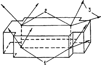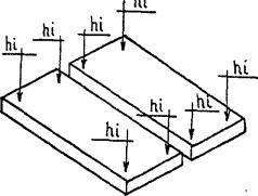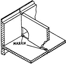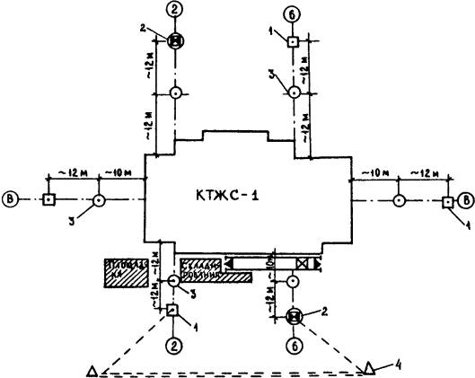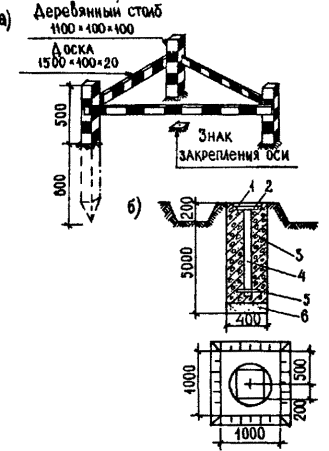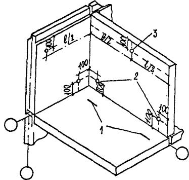 конструкциях: Значения погрешностей передачи точек осей по высоте: при высоте проектирования осей до 15 м £ 2 мм; до 60 м < 2,5 мм. Предельные отклонения следует определять по формуле: d ³ 2,5m (1), где m - средняя квадратическая погрешность. Примечание. Отклонение размера между двумя смежными осями от проектного не должно быть более 1 мм. 5.6. Закрепление створов осей следует производить откраской рисок на панелях перекрытий. Рекомендуемые типы открасок приведены на рис. 4. 5.7. Перенос осей при возведении нулевого цикла следует производить теодолитами на инвентарные металлические скамейки (чертеж - архивный № 4264 треста Мосоргстрой) или на ранее смонтированные железобетонные конструкции. 5.8. По окончании строительно-монтажных работ по возведении подземной части здания геослужбами трестов фундаментостроения следует составлять исполнительные схемы смонтированных конструктивных элементов. Со схемами должны быть ознакомлены геодезисты субподрядных организаций, приступающих к монтажу надземной части здания. 5.9. Приемке-передаче геодезических работ подлежат в натуре и по акту знаки закрепления осей, реперы, исполнительные схемы смонтированных элементов. Осевые знаки и высотные отметки могут быть закреплены на ранее смонтированных элементах трудносмываемой краской. 5.10. Правильность выполнения разбивочных работ после окончания монтажа подземной части додана проверяться путем измерений между рисками открасок осей на наружных плоскостях панелей стен и пересечений створов осей на перекрытии. Дополнительно должны быть измерены, как правило, не менее 2-х углов. Предельные отклонения от проектных значений углов не должны превышать 30", при длине направлений до 50 м и 15" при длине направлений до 100 м. 5.11. На все несущие элементы подземной части трестами фундаментостроения должны быть составлены и подписаны авторским надзором схемы исполнительных съемок. Количество контрольных измерений при контроле правильности исполнительных съемок должно быть в плане, не менее: пяти панелей стен и всех лифтовых шахт на каждую секцию дома; а по высоте - одна отметка опорной поверхности на каждые 50 кв. м сдаваемого участка. Правильность результатов исполнительной съемки считается удовлетворительной, если отклонения измеренных и показанных на схемах результатов съемки не расходятся более чем на 10%. 5.12. На перекрытии над техподпольем следует создавать внутренние разбивочные сети исходного горизонта (ВРСИГ). Вариант расположения точек ВРСИГ приведен на рис. 5. Если по технологии монтажа в захватку входят менее 3-х базисных точек, то при создании ВРСИГ следует выбирать ориентирные направления. В качестве ориентиров следует выбирать удаленные не менее чем на 0,1 км от корпуса отчетливо видимые предметы на местности. При одновременном монтаже более 2-х секций допускается перенос неполного количества точек ВРСИГ с исходного горизонта на монтажный. При этом количество переносимых точек должно обеспечивать контроль правильности переноса. Контроль осуществляют измерением расстояния между точками ВРСИГ и углов (рис. 6). 5.13. Перенос осей на монтажные горизонты следует производить методом вертикального визирования. Методика переноса осей вертикальным визированием, а также привязка переносимых осей и расположение отверстий для вертикального визирования к ос