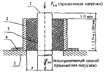 где L - длина образца, мм; d - наружный диаметр трубы, мм; l - длина каждого рычага, мм. 9.21 Прочность на сдвиг в тангенциальном направлении при температуре (140±2) °С определяют в соответствии с 9.20 на образцах изолированных труб длиной 3 м на выделенных не менее трех участках тепловой изоляции, расположенных на расстоянии не менее 1 м от торцов теплоизоляции. При этом по трубе пропускают теплоноситель с температурой 170 °С в течение 1450 ч. Затем температуру теплоносителя снижают до 140 °С и после выдержки в течение суток определяют значение прочности по 9.20. 9.22 Радиальную ползучесть тепловой изоляции труб определяют на трех образцах с диаметром стальной трубы 57 мм, наружным диаметром полиэтиленовой оболочки 125 мм и длиной теплоизоляции 250 мм на выделенном поперечными разрезами фрагменте тепловой изоляции длиной 100 мм. Свободные от тепловой изоляции концы стальных труб должны опираться на скользящие опоры согласно рисунку 4. По образцам пропускают теплоноситель с температурой (140 ± 2)°С в течение одной недели, после чего к фрагменту изоляции прилагают вертикальную нагрузку (1,5 ± 0,01) кН (рисунок 4). 1 - стальная труба; 2 - индикатор; 3 - труба-оболочка из полиэтилена и изоляция из пенополиуретана; 4 - приспособление для приложения нагрузки; 5 - опора Рисунок 4 Радиальную ползучесть тепловой изоляции замеряют в верхней части середины фрагмента до начала нагрузки (исходное значение) и в период воздействия нагрузки через 100 ч и через 1000 ч. Замеры производят индикатором часового типа с точностью до 0,05 мм. Величину радиальной ползучести определяют как среднеарифметическое значение результатов испытаний трех образцов. 9.23 Стойкость полиэтиленовой оболочки при постоянном внутреннем давлении определяют на образцах трубы-оболочки по ГОСТ 24157. 10 Транспортирование и хранение10.1 Перевозку изолированных труб и фасонных изделий осуществляют автомобильным, железнодорожным и водным транспортом в соответствии с правилами перевозки грузов, обеспечивающими сохранность изоляции и исключающими возникновение продольного прогиба. 10.2 Перевозку труб и фасонных изделий, погрузочно-разгрузочные работы осуществляют в интервале температур, указанных для проведения строительно-монтажных работ, но не ниже минус 18 °С. 10.3 Для погрузки и разгрузки труб и фасонных изделий следует применять специальные траверсы и мягкие полотенца шириной 50 - 200 мм. Не допускается использовать цепи, канаты и другие грузозахватные устройства, вызывающие повреждение изоляции. Для труб диаметром более 108 мм возможно использование торцевых захватов со специальными траверсами. 10.4 Строго запрещается сбрасывание, скатывание, соударение труб, волочение их по земле. 10.5 Укладку труб в транспортные средства необходимо производить ровными рядами, не допуская перехлестов. В качестве амортизатора между трубами с целью исключения повреждения покрытия следует использовать поролон, резину и т.п. Для обеспечения свободного пропуска обвязок между трубами и дном кузова автомашины укладывают прокладки. Не допускается раскатывание нижнего ряда труб при транспортировании. 10.6 Трубы и фасонные изделия должны храниться на ровных горизонтальных площадках, очищенных от камней и других посторонних предметов, которые могут привести к повреждению полиэтиленовой оболочки. 10.7 Складирование труб производят шта