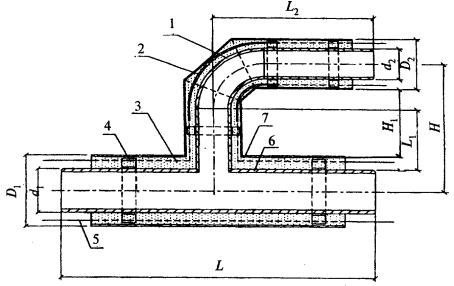 В.5 Тройник параллельный В.5.1 Конструкция и размеры параллельного тройника должны соответствовать рисунку В.5 и таблице В.7. 1 - стальной отвод; 2 - электроизоляционная трубка по ГОСТ 22056; 3 - изоляция из пенополиуретана; 4 - центрирующая опора; 5 - проводник-индикатор системы ОДК; 6 - стальная труба; 7 - оболочка из полиэтилена. Рисунок В.5 - Тройник параллельный В.5.2 Пример условного обозначения параллельного тройника диаметром 426-219 мм с изоляцией типа 2: Тройник параллельный Ст 426-219-2-ППУ-ПЭ ГОСТ 30732-2001 Таблица В.7- Тройник параллельный В миллиметрах Расстояние между оболочками Н1=150