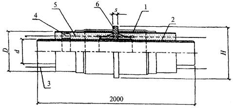 1 - оболочка из полиэтилена; 2 - стальная труба; 3 - проводник-индикатор системы ОДК; 4 - центрирующая опора; 5 - изоляция из пенополиуретана; 6 - неподвижная опора Рисунок В.8 - Неподвижная опора В.8.2 Пример условного обозначения неподвижной опоры для трубы диаметром 76 мм, высотой 275 мм и толщиной 15 мм с изоляцией типа 1: Неподвижная опора Ст 76- 275х15-1 -ППУ-ПЭ ГОСТ 30732-2001. Таблица В.10 - Неподвижная опора В миллиметрах