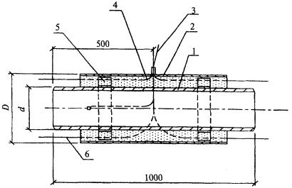 где Fакс - осевая нагрузка, Н L - длина образца, мм; d - наружный диаметр трубы, мм. 9.19 Прочность на сдвиг в осевом направлении при температуре (140±2) °С определяют в соответствии с требованиями настоящего стандарта при нагреве стальной трубы в течение 30 мин до 140 °С и ее выдержке при этой температуре в течение 30 мин до приложения нагрузки. 1 - стальная труба; 2 - труба-оболочка из полиэтилена; 3 - изоляция из пенополиуретана; 4 - направляющее кольцо; 5 - плита основания машины для испытания Рисунок 2 9.20 Прочность, на сдвиг в тангенциальном направлении при температуре (23±2) °С определяют на отдельно изготовленном образце или на фрагменте изолированной трубы, из которой выделяют поперечными разрезами до стальной трубы слой тепловой изоляции длиной, равной 0,75 диаметра стальной трубы, но не менее 100 мм (рисунок 3). 1 - стальная труба; 2 - изоляция из пенополиуретана; 3 - труба-оболочка из полиэтилена; 4 - хомут; 5 - рычаг; 6 - неподвижная опора Рисунок 3 Тангенциальную нагрузку прилагают к полиэтиленовой оболочке с помощью двух рычагов длиной по 1000 мм, расположенных соосно горизонтально с двух сторон оболочки. Скорость приложения нагрузки к концам рычагов должна быть равна 25 мм/мин. Прочность