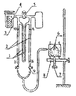 где t1и t2 - температура на поверхности трубы и изоляции, °С; l - длина рабочей секции, м; d - наружный диаметр стальной трубы, м; D - наружный диаметр трубы-оболочки, м. Тепловой поток Q, Вт, определяют по формуле Q =0,86IV, (Е.2) где I - среднее замеренное значение силы тока, А; V - замеренное напряжение рабочего нагревателя, В. ПРИЛОЖЕНИЕ Ж(рекомендуемое) Определение содержания закрытых порСущность метода заключается в измерении объема воздуха, вытесненного образцом в процессе испытания. Ж.1 Аппаратура Воздушный пикнометр (рисунок Ж.1). Прибор состоит из двух симметрично расположенных и равных по объему систем (рабочей и контрольной), соединенных через два параллельных манометра. Один из манометров - ртутный (2), внутренним диаметром (5 ±0,5) мм и высотой (60 ± 0,5) см, используется для одновременного изменения объемов систем на определенную величину, а также для выравнивания давлений в процессе проведения испытаний; другой манометр с дибутилфталатом (7), внутренним диаметром (3 ± 0,3) мм и высотой (40 ± 0,5) см, - для наблюдения за разностью давлений в обеих системах. Рабочая система объемом (320 ± 10) см3 включает в себя камеру 3 для образца 4 и левую половину манометров 1 и 2. Камера для образца объемом (300 ± 10 см3) представляет собой цилиндрический сосуд с тщательно пришлифованной крышкой. С помощью крана 5 обе системы могут сообщаться с окружающей атмосферой или быть изолированными от нее и друг от друга. Колба 6 с ртутью служит для изменения давления в обеих системах прибора. Весы с погрешностью не более 0,01 г. Линейка металлическая по ГОСТ 427. Ж.2 Подготовка к испытанию и проведение испытания Ж.2.1 Для испытания из средней части теплоизоляционного слоя вырезают три образца-кубика размером (25 ± 0,5) мм. Допускается изготавливать образцы размером 25×25×t мм, где t - толщина пенополиуретана. На поверхности образцов не должно быть пустот (каверн), трещин и других видимых дефектов. 1 - манометр с дибутилфталатом; 2 - ртутный манометр; 3 - камера; 4 - образец; 5 - воздушный кран; 6 - колба с ртутью; 7 - винт; 8 - подставка; 9- кран Рисунок Ж.1 Перед испытанием образцы кондиционируют в течение 24 ч при температуре (23 ±2) °С. Ж.2.2 Проверяют симметричность обеих систем прибора (отсутствие разности давлений в обеих системах при максимальном разряжении их без образца), для этого используют монолитный образец из полиуретана, размером по Ж.2.1, объем которого Vм измеряют с погрешностью не более 0,1 см3. Ж.2.3 Обе системы с окружающей атмосферой соединяют краном 5. Перемещая колбу 6 с помощью подставки 8 (грубо) и винта 7 (точно), устанавливают уровень ртути по нижней части мениска на отметке А. Ж.2.4 Закрывают камеру крышкой и обе системы изолируют друг от друга и от окружающей атмосферы. Колбу 6 плавно опускают и устанавливают уровень на отметке Б. По истечении (30 ±1) с. измеряют уровень ртути (R0) в левом колене манометра 2 Ж.2.5 Обе системы соединяют с окружающей атмосферой и повторяют испытание в соответствии с Ж.2.3, Ж.2.4 до тех пор, пока три последовательных измерения не дадут одинаковых результатов. Расхождение между последовательными измерениями больше чем на 1 мм указывает на возможность утечки в приборе. Ж.2.6 Монолитный образец взвешивают с погрешностью не более 0,01 г, помещают в камеру и плотно закрывают крышкой. Затем устанавливают уровень ртути на отметке А и обе системы изолируют друг от друга и от окружающей атмос