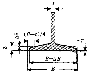 Примечания. 1. Измерения отклонений Р1 и Р3 выполняют на всем участке возможного движения крана через интервалы не более 5 м. 2. При изменении температуры на каждые 10 °С устанавливаемый при устройстве зазор Р5 изменяют на 1,5 мм, например при температуре плюс 20 °С установленный зазор между рельсами должен быть равен 3 мм, а при температуре минус 10 °С - 7,5 мм. 3. Величины отклонений для козловых кранов пролетом 30 м и более принимают как для кранов-перегружателей. Приложение 11КРИТЕРИИ БРАКОВКИ КРАНОВОГО ПУТИКрановый путь опорных кранов подлежит браковке при наличии следующих дефектов и повреждений: трещин и сколов любых размеров; вертикального, горизонтального или приведенного (вертикального плюс половина горизонтального) износа головки рельса более 15% от соответствующего размера неизношенного профиля. Браковку шпал (или полушпал) наземного кранового пути производят при наличии следующих дефектов и повреждений: в железобетонных шпалах не должно быть сколов бетона до обнажения арматуры, а также иных сколов бетона на участке длиной более 250 мм; в железобетонных шпалах не должно быть сплошных опоясывающих или продольных трещин длиной более 100 мм с раскрытием более 0,3 мм; в деревянных полушпалах не должно быть излома, поперечных трещин глубиной более 50 мм и длиной свыше 200 мм, поверхностной гнили размером более 20 мм под накладками и более 60 мм на остальных поверхностях. Монорельсовый путь подвесных электрических талей и тележек подлежит браковке при наличии: трещин и выколов любых размеров; уменьшении ширины пояса рельса вследствие износа DВ³0,05 В (см. рисунок); уменьшении толщины полки рельса вследствие износа Dd³0,25d при одновременном отгибе полки f1£0,15d (см. рисунок);