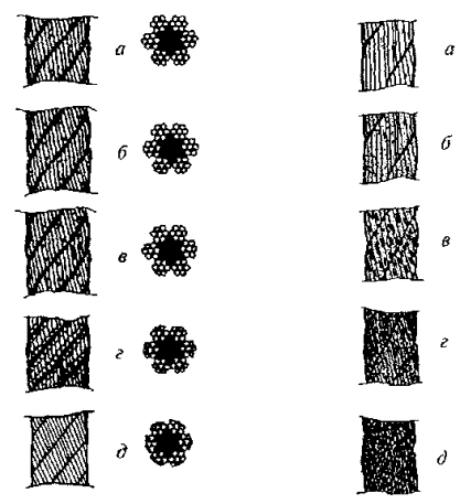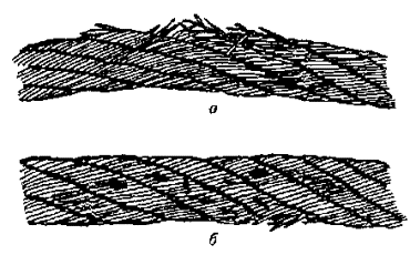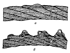 Рис. 2. Сочетание обрывов проволок с их износом: а - в канате крестовой свивки; б - в канате односторонней свивки
