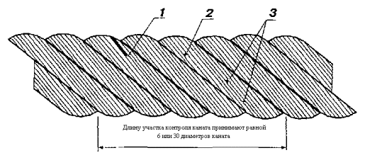 Примечания. 1. n - число несущих проволок в наружных прядях каната; d - диаметр каната, мм. 2. Проволоки заполнения не считаются несущими, поэтому не подлежат учету. В канатах с несколькими слоями прядей учитываются проволоки только видимого наружного слоя. В канатах со стальным сердечником последний рассматривается как внутренняя прядь и не учитывается. 3. Число обрывов не следует путать с количеством оборванных концов проволок, которых может быть в 2 раза больше. 4. Для канатов конструкции с диаметром наружных проволок во внешних прядях, превышающим диаметр проволок нижележащих слоев, класс конструкции понижен и отмечен звездочкой. 5. При работе каната полностью или частично с блоками из синтетического материала c синтетической футеровкой отмечается появление значительного числа обрывов проволок внутри каната до появления видимых признаков обрывов проволок или интенсивного износа на наружной поверхности каната. Такие канаты отбраковываются с учетом потери внутреннего сечения. 6. Незаполненные строки в графе «Конструкции канатов по ИСО и государственным стандартам» означают отсутствие конструкций канатов с соответствующим числом проволок. При появлении таких конструкций канатов, а также для канатов с общим числом проволок более 300 число обрывов проволок, при которых канат бракуется, определяется по формулам, приведенным в нижней строке таблицы, причем полученное значение округляется до целого в большую сторону. Рис. 4. Пример определения числа обрывов наружных проволок стального каната: 1 - на участке контроля у оборванной проволоки обнаружен только один конец, ответный конец оборванной проволоки отсутствует. Данный дефект соответствует одному обрыву; 2 - на участке контроля у оборванной проволоки в наличии два конца. Данный дефект соответствует одному обрыву; 3 - на участке контроля одна из проволок имеет двукратное нарушение целостности. Поскольку нарушения целостности принадлежат только одной проволоке, данный дефект суммарно соответствует одному обрыву При наличии у каната поверхностного износа или коррозии проволок число обрывов как признак браковки должно быть уменьшено в соответствии с данными табл. 2. При уменьшении первоначального диаметра наружных проволок в результате износа (см. рис. 5, д) или коррозии (см. рис. 6, д) на 40% и более канат бракуется. Определение износа или коррозии проволок по диаметру производится с помощью микрометра или иного инструмента, обеспечивающего аналогичную точность. При меньшем, чем указано в табл. 1, числе обрывов проволок, а также при наличии поверхностного износа проволок без их обрыва канат может быть допущен к работе при условии тщательного наблюдения за его состоянием при периодических осмотрах с записью результатов в журнал осмотров и смены каната по достижении степени износа, указанной в табл. 2. Таблица 2 Нормы браковки каната в зависимости от поверхностного износа или коррозии