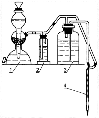 где V1 - объем раствора трилона Б, израсходованного на титрование, см3; С - массовая концентрация раствора трилона Б, г/см3; т - масса навески, г. 5.4.2. Нормы точности и нормативы контроля точности определений массовой доли оксида железа (III) приведены в таблице 2. 6. ТИТРИМЕТРИЧЕСКИЙ ТИТАНОМЕТРИЧЕСКИЙ МЕТОД ОПРЕДЕЛЕНИЯ ОКСИДА ЖЕЛЕЗА (III) (ПРИ МАССОВОЙ ДОЛЕ ОТ 2,5 ДО 20 %).6.1. Сущность метода. Метод основан на восстановлении роданидного комплекса железа раствором сернокислой или солянокислой соли титана (III). Метод имеет большие преимущества при анализе хромсодержащих огнеупоров, так как не требует предварительного отделения хрома. 6.2. Аппаратура, реактивы и растворы. Установка для хранения раствора соли титана (III) приведена на рисунке 1. Тигли платиновые по ГОСТ 6563 № 100-10. 1 - аппарат Киппа; 2 - промывалка для газа, заполненная раствором сернокислого титана (III) 50 г/дм3; 3 - сосуд с рабочим раствором; 4 - бюретка. Рисунок 1. Натрий углекислый по ГОСТ 83. Калий пиросернокислый по ГОСТ 7172. Кислота серная по ГОСТ 4204. Кислота соляная по ГОСТ 3118, разбавленная 1 : 1. Кислота фтористоводородная по ГОСТ 10484. Титан (III) сернокислый, раствор с массовой долей 15 % по нормативной документации, разбавленный 1 : 10. На каждый 1 дм3 разбавленного раствора соли титана прибавляют 10 см3 серной кислоты. Раствор хранят в среде водорода или углекислого газа в установке, показанной на рисунке 1. Калий роданистый по ГОСТ 4139, раствор с массовой долей 10 %. Аммоний роданистый по ГОСТ 27067, раствор с массовой долей 5 %. Железа оксид по нормативной документации, х. ч., или железо карбонильное по ГОСТ 13610. Стандартный раствор оксида железа (III) В (см. 5.2). Массовую концентрацию раствора сернокислого титана (III) по оксиду железа (III) устанавливают следующим образом. Отмеряют 25 см3 стандартного раствора оксида железа (III) в коническую колбу вместимостью 300 см3, прибавляют 10 см3 раствора соляной кислоты (1 : 1), 50 - 70 см3 воды, 5 см3 раствора роданистого калия или роданистого аммония, 0,3 - 0,5 г углекислого натрия и титруют при энергичном перемешивании раствором сернокислого титана (III) до исчезновения красной окраски. Массовую концентрацию раствора сернокислого титана (III) C1, г/см3, оксида железа (III), вычисляют по формуле