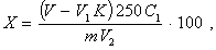 где m1 - масса навески цинка, г. Индикатор ксиленоловый оранжевый: 0,2 г индикатора растирают с 20 г хлористого калия, смесь хранят в сосуде из темного стекла. Калий хлористый по ГОСТ 4234. 4.2.1. Для установления массовой концентрации раствора трилона Б по оксиду алюминия в коническую колбу вместимостью 300 см3 помещают 10 см3 стандартного раствора оксида алюминия, приливают 2 - 3 см3 соляной кислоты, 70 - 100 см3 воды и 25 см3 раствора трилона Б. Содержимое колбы нагревают до кипения, остывший до 70 - 80 °С раствор нейтрализуют раствором аммиака до переходного цвета индикаторной бумаги Конго, приливают 15 - 20 см3 буферного раствора с рН 4,5 - 5,0, 5 - 7 капель раствора индикатора ПАН и оттитровывают избыток раствора трилона Б раствором сернокислой меди до перехода окраски раствора из желто-зеленой в сине-фиолетовую. Проводят три параллельных титрования. Массовую концентрацию раствора трилона Б С2, г/см3 оксида алюминия, вычисляют по формуле
