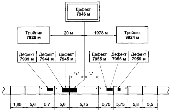 где V - общее количество дефектных мест, подлежащих ежегодной идентификации на всех N обследованных трубопроводах; Пj - приоритет (в баллах) j-го трубопровода. 7 ОПРЕДЕЛЕНИЕ МЕСТОПОЛОЖЕНИЯ ДЕФЕКТОВ НА ТРАССЕ ТРУБОПРОВОДАДля определения местоположения дефекта на трассе трубопровода необходимо руководствоваться схемой реперных точек обследованного участка трубопровода. В качестве реперных точек используются естественные маркеры (задвижки, краны, тройники, врезки и т.д.), а также искусственные маркеры, которые подразделяются на стационарные (сегменты труб, уложенные на трубопровод) и переносные электронные. Оценка приоритетов трубопроводов на техническое обслуживание