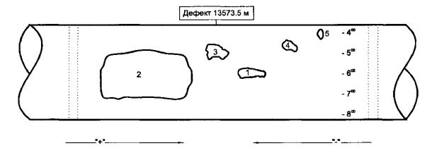 Рис. 3 Схема коррозионных повреждений наружной поверхности газопровода (фрагмент) Идентификация внутренних дефектов производится ультразвуковыми дефектоскопом и толщиномером. Толщинометрия осуществляется, как правило, по сетке с шагом, зависящим от степени перепада толщин. Границы обнаруженных дефектов на трубе обводятся масляной краской. 11 ЗАКЛЮЧЕНИЕ О СТЕПЕНИ ОПАСНОСТИ ДЕФЕКТОВПо результатам идентификации дефектов с учетом их уточненных геометрических параметров и местоположения проводится расчет несущей способности поврежденных участков трубопроводов (согласно «Рекомендациям по расчету трубопроводов с дефектами»). Если дефектный участок в результате уточненного расчета попадает в разряд «опасный» - необходимы ремонтные работы на этом участке. В противном случае по распоряжению главного инженера управления производится переизоляция трубопровода и засыпка шурфов. ЗАКЛЮЧЕНИЕРазработанное Руководство охватывает комплекс работ по организации и проведению следующих работ: - приемка результатов внутритрубной инспекции; - анализ данных внутритрубной инспекции; - ранжировка дефектов; - расчет приоритетов трубопроводов; - идентификация дефектов. Работы по предварительной ранжировке дефектов на основании данных внутритрубной инспекции и окончательной оценке степени их опасности по результатам идентификации ориентированы на применение «Рекомендаций по расчету трубопроводов с дефектами». ПРИЛОЖЕНИЕ