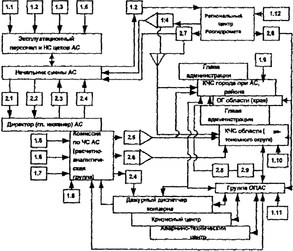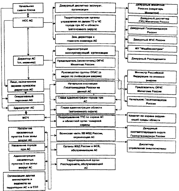 3.2.3. Директор (главный инженер) АС после получения от НСС первичной информации о нарушении, оценки и прогноза его развития и (или) после ознакомления с обстановкой на месте (в случае необходимости) принимает решение об объявлении на АС состояния "Аварийная готовность" и (или) "Аварийная обстановка" и введении в действие Плана мероприятий по защите и дает соответствующие указания председателю КЧСО, НСС и начальнику штаба по делам ГО и ЧС АС (или лицу, его замещающему). Принятое решение доводится до сведения всего персонала АС с помощью имеющихся средств связи (громкоговорящей, прямой и АТС) и оповещения. 3.2.4. При объявлении на АС состояния "Аварийная готовность" НСС немедленно информирует руководящий состав АС для приведения в состояние готовности персонала и оборудования для устранения нарушения, а также для локализации нарушения и ликвидации его последствий. Одновременно уточняется оповещение в соответствии с приложениями 8 и 9. 3.2.5. При отсутствии на АС директора (главного инженера) решение об объявлении состояния "Аварийная готовность" и (или) "Аварийная обстановка" и введении в действие Плана мероприятий по защите принимает НСС. 3.2.6. Введение в действие Плана мероприятий по защите осуществляется путем последовательного выполнения календарного плана-графика проведения основных мероприятий ГО в случае аварии на АС (приложение 10). 3.2.7. Складывающаяся в результате аварии обстановка (по данным постов контроля и всех видов разведки, а также по результатам лабораторного контроля отобранных для анализа проб) наносится на заранее подготовленную топографическую карту масштабом 1:200 000. 3.2.8. Основные действия при установлении факта нарушения оперативного персонала цехов, начальника смены отдела радиационной безопасности, НСС, руководителей структурных подразделений АС и директора АС (РАР) с момента объявления на АС состояния "Аварийная готовность" и (или) "Аварийная обстановка" приведены соответственно в приложениях 11, 12, 13, 14 и 15. Приложения к разделу. 7. Категории нарушений в работе АС. 8. Схема оповещения об объявлении состояния "Аварийная готовность" и (или) "Аварийная обстановка" на АС. 9. Список абонентов оповещения о состоянии "Аварийная готовность" и (или) "Аварийная обстановка" на АС. 10. Календарный план-график проведения основных мероприятий ГО в случае аварии на АС. 11. Основные действия оперативного персонала цехов (отделов, лабораторий) АС. 12. Основные действия начальника смены отдела радиационной безопасности АС. 13. Основные действия НСС (до прибытия директора на АС). 14. Основные действия руководителей структурных подразделений АС. 15. План-график действий директора АС (РАР). 3.3. Основные мероприятия по защите персоналаВ каждом подразделе подробно излагаются организация указанных в нём мероприятий на каждой АС с привлечением необходимых сил и средств, их укомплектованность специалистами, оснащенность СИЗ, приборами радиационной и химической разведки и дозиметрического контроля, имуществом, инструментом, техникой. 3.3.1. Организация оповещения и связиПредусматривает подробное изложение организации и порядка: · передачи информации и оповещения в случае аварии или радиационно опасной ситуации с момента объявления на АС состояния "Аварийная готовность" и (или) "Аварийная обстановка" в соответствии с пп. 6.3 и 6.4 Положения о порядке
