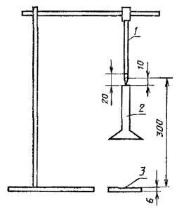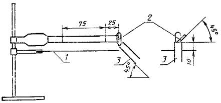 1 - образец; 2 - горелка; 3 - вата Черт. 2 Под образцом на расстоянии (9,5±0,5) мм от его нижней кромки в зажиме горизонтально закрепляют проволочную сетку таким образом, чтобы положение свободного конца образца совпало с краем сетки. Испытания образца проводят на установке в соответствии с черт. 1. 3.5. При испытании по методу Б образец закрепляют в зажиме так, чтобы его продольная ось располагалась вертикально и нижний конец находился на расстоянии 300 мм от слоя гигроскопической хирургической ваты площадью 50´50 мм и толщиной 6 мм. Испытание образца проводят на установке в соответствии с черт. 2. 3.6. Газовую горелку, находящуюся в вертикальном положении на расстоянии не менее 150 мм от образца, зажигают и регулируют так, чтобы высота голубого пламени с желтым кончиком была (25±1) мм для метода А и (20±1) мм для метода Б. Подачу воздуха регулируют до тех пор, пока не исчезнет желтый кончик пламени. Высоту пламени измеряют еще раз и при необходимости корректируют. 4. ПРОВЕДЕНИЕ ИСПЫТАНИЙ4.1. Метод А. 4.1.1. Сущность метода заключается в определении скорости распространения пламени по горизонтально закрепленному образцу. Горизонтально закрепленные образцы по стойкости к горению относят к категории ПГ (пламя горелки является источником воспламенения горизонтально закрепленного образца). 4.1.2. Пламя горелки подносят к нижней кромке свободного конца образца. Центральная ось патрубка горелки должна находиться в той же вертикальной плоскости, что и продольная ось образца, и под углом 45° к горизонтали. Пламя подносят на 30с без изменения положения горелки так, чтобы торец образца был погружен в пламя на глубину около 6,5 мм, и затем удаляют от образца. 4.1.3. Если образец сгорает до метки 25 мм менее чем на 30 с, то горелку удаляют от образца, как только пламя достигает метки 25 мм. 4.1.4. Если образец продолжает гореть после удаления горелки, то фиксируют время t (с) горения образца между метками и рассчитывают скорость горения v (мм/мин). 4.1.5. Если фронт пламени распространяется от метки 25 мм, но не достиг метки 100 мм, фиксируют время горения и длину L (мм) поврежденной части образца между меткой 25 мм и местом на образце, до которого распространился фронт пламени. 4.1.6. Материал соответствует категории ПГ, если при его горении выполняются следующие условия: 1) для образцов толщиной от 3 до 13 мм скорость горения не должна превышать 40 мм/мин на участке между метками; 2) для образцов толщиной менее 3 мм скорость горения не должна превышать 75 мм/мин на участке между метками; 3) горение прекращается до того, как пламя достигнет метки 100 мм. 4.1.7. Если хотя бы один образец из пяти не удовлетворяет условиям п. 4.1.6, то испытание проводят еще на пяти образцах. Если хотя бы один образец второй серии не удовлетворяет требованиям п. 4.1.6, то материал не может быть классифицирован как ПГ. 4.1.8. Если скорость горения нельзя рассчитать (образец гаснет после удаления пламени горелки), испытание следует провести по методу Б, чтобы определить наивысшую категорию стойкости к горению, к которой может быть отнесен данный материал. 4.2.1. Сущность метода заключается в определении времени горения и тления вертикально закрепленного образца. По стойкости к горению вертикально закрепленные образцы относят к категориям ПВ-0, ПВ-1, ПВ-2 (пламя горелки является источником воспламенения вертикально закрепленного образца) 