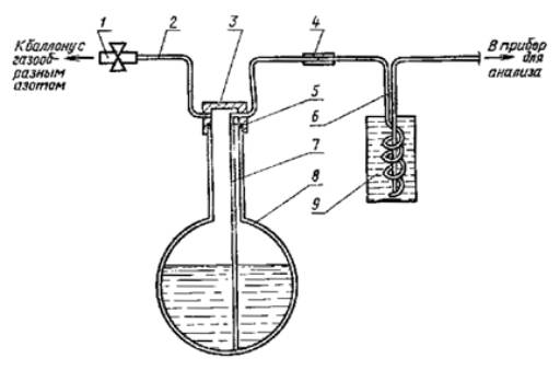 Допускается определение объемной доли кислорода в газообразном азоте, транспортируемом по трубопроводу, промышленными автоматическими газоанализаторами непрерывного действия по ГОСТ 13320-81. Погрешность измерения не должна превышать 10 отн. %. Объемную долю кислорода допускается определять многошкальными приборами с гальванической ячейкой с твердым электролитом с относительной погрешностью измерений не выше 10 %. При этом объемная доля водорода и горючих примесей в анализируемом азоте не должна превышать 1 % от измеряемой объемной доли кислорода. При разногласиях в оценке объемной доли кислорода определение проводить по методу, изложенному в п. 3.3. (Измененная редакция, Изм. № 2, 3). 3.4. Определение объемной доли кислорода в количестве свыше 0,5 % Объемную долю кислорода определяют абсорбционным методом по изменению объема пробы азота после поглощения кислорода щелочным раствором пирогаллола. 3.4.1. Реактивы, растворы и приборы: вода дистиллированная по ГОСТ 6709-72; поглотительный раствор, готовят следующим образом: 44 г пирогаллола «А», растворяют в 132 см3 водного раствора гидроокиси калия с массовой долей 37%; раствор наливают в поглотительный сосуд газоанализатора и заливают тонким слоем вазелинового масла; калия гидроокись, водный раствор с массовой долей 37%; ланолин безводный; масло вазелиновое; жидкость запирающая, готовят растворением 61 г натрия сернокислого кристаллического по ГОСТ 4171-76 или 27 г натрия сернокислого безводного по ГОСТ 4166-76 и 10 г серной кислоты в 108 см3 воды. Жидкость подкрашивают добавлением нескольких капель раствора метилового оранжевого; метиловый оранжевый (индикатор) 0,1%-ный водный раствор; кислота серная по ГОСТ 4204-77; газоанализатор химический типа КГА; цилиндр 1-250 по ГОСТ 1770-74; весы лабораторные общего назначения с наибольшим пределом взвешивания 200 г 2-го класса точности. (Измененная редакция, Изм. № 2, 3). 3.4.2. Проведение анализа Анализ на приборе типа КГА проводят по ГОСТ 5439-76, при этом используют один поглотительный сосуд, заполненный щелочным раствором пирогаллола. (Новая редакция, Изм. № 3). 3.4.3. Обработка результатов Объемную долю кислорода (X1) в процентах вычисляют по формуле X1=100 - V, где 100 - первоначальный объем азота, см3; V - объем непоглощенных газов, см3. За результат анализа принимают среднее арифметическое результатов двух параллельных определений, абсолютное расхождение между которыми не превышает допускаемое расхождение, равное 0,2%. Допускаемая абсолютная суммарная погрешность результата анализа ±0,2% при доверительной вероятности 0,95. Допускается определение содержания кислорода в газообразном азоте, транспортируемом по трубопроводу и наполняемом в баллоны или автореципиенты промышленными автоматическими газоанализаторами непрерывного действия по ГОСТ 13320-81. Погрешность измерения не должна превышать 10 % отн. При разногласиях в оценке объемной доли кислорода определение проводить по методу, изложенному в п. 3.4. (Измененная редакция, Изм. № 2, 3). 3.5. Определение объемной доли водяного пара в газообразном азоте 3.5.1. Аппаратура Влагомеры газов кулонометрические, рассчитанные на измерение микроконцентраций водяного пара (типа «Байкал-3» и др.), с относительной погрешностью измерения не выше 10 % в области измерений от 0 до 20 млн-1 (ppm) и не выше 5% при более высоких концентрациях. 3.5.2. Проведение анализа Ку