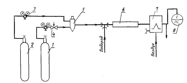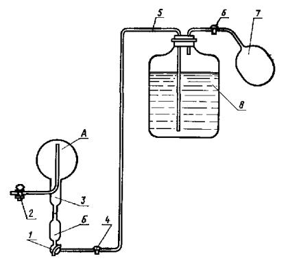 Если концентрация раствора сернокислой меди не точно 0,05 моль/дм3, то значения, приведенные в графах 3 и 6, умножают на коэффициент K1. (Измененная редакция, Изм. № 2, 3). 3.3.2. Описание прибора Установка для определения кислорода (черт. 3) состоит из сосуда для анализа, бутыли со стеклянным сифоном для аммиачного раствора однохлористой меди и пробирок с образцовыми растворами.