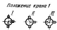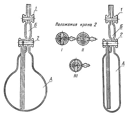 I - промывка поглотительным раствором крана и коммуникаций; II - ввод раствора в объем Б; III - кран закрыт. 1 - кран серповидный; 2, 4, 6 - краны одноходовые; 3 - сосуд для анализа; 5 - сифон; 7 - камера резиновая, заполненная инертным газом; 8 - бутыль с поглотительным раствором. Черт. 3 Сосуд для анализа типа СВ-7631М (черт. 4) имеет два объема А и Б, разделенные двухходовым краном 2, снабженным отростком для присоединения к месту отбора пробы, и одноходовым краном 1 для введения в сосуд поглотительного раствора. Вместимость объема А от 100 до 5000 см3; вместимость объема Б около 25 см3. Сосуд 3 (черт. 3) имеет серповидный кран 1 для введения поглотительного раствора в объем Б и кран 2 для присоединения к месту отбора пробы. Объемы А и Б соединены трубкой небольшого диаметра с круговой меткой, ограничивающей вместимость объема Б около 25 см3. Вместимость объема А для сосудов всех типов определяют с погрешностью не более 0,1 см3 по объему воды или ее массе. I - соединение сосуда А с атмосферой; II - кран закрыт; III - соединение сосуда А с сосудом Б; 1 - одноходовой кран; 2 - двухходовой кран. Черт. 4 В зависимости от объемной доли кислорода в анализируемом азоте используют сосуды вместимостью: около 100 см3 - для газообразного и жидкого азота с объемной долей кислорода до 0,5 %; не менее 1000 см3 - для газообразного азота с объемной долей кислорода до 0,005%; не менее 5000 см3 - для газообразного и жидкого азота с объемной долей кислорода до 0,001%. (Измененная редакция, Изм. № 2). 3.3.3. Проведение анализа Краны 1 и 2 открывают и присоединяют сосуд для анализа к месту отбора пробы. Продувают сосуд не менее чем десятикратным объемом анализируемого газа. Уменьшив поток газа, закрывают кран 1, затем кран 2 и отсоединяют сосуд от места отбора пробы. Давление газа в сосуде выравнивают с атмосферным быстрым поворотом крана 2, кончик которого предварительно погружают в воду. Отмечают барометрическое давление и температуру помещения. Заполняют объем Б через кран 1 раствором однохлористой меди, предварительно сливая из сифона первую порцию раствора. Закрывают кран 1. Подбирают образцовый раствор равной окраски с окраской раствора в объеме Б. Раствор однохлористой меди переливают в объем А. Энергично встряхивают сосуд до полного поглощения раствором кислорода из анализируемого газа. Возвращают раствор в объем Б и подбирают образцовый раствор равной окраски с окраской раствора в объеме Б. (Измененная редакция, Изм. № 3). 3.3.4. Обработка результатов Объемную долю кислорода (X1) в процентах вычисляют по формуле