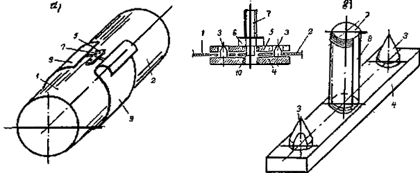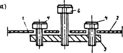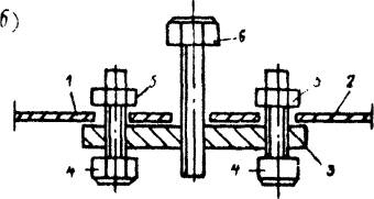 Рис. 2. Узел бесфланцевого соединения воздуховодов с винтовыми фиксирующими элементами; а, б - варианты с верхним и нижним расположением болтов, 1, 2 - воздуховоды; 3 - пластина; 4 - болт с головкой; 5 - гайка, 6 - вспомогательный съемный болт СОДЕРЖАНИЕ