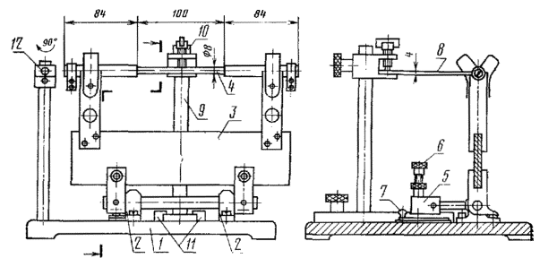 1 - опорная плита; 2 - подшипники вращения; 3 - изоляционная пластина держателя стержня каления; 4 - стержень каления; 5 - противовес; 6 - ограничительный винт; 7 - рычаг; 8 - образец; 9 - стойка держателя образца; 10 - держатель образца (зажим); 11 - салазки; 12 - установочный металлический стержень. держатель стержня каления, установленный на подшипниках вращения, способный поворачиваться вокруг горизонтальной оси. Держатель состоит из пластины из изоляционного материала (асбест, керамика) с двумя зажимами, в которые вставляются металлизированные концы стержня каления; держатель образца, укрепленный на стойке, перемещаемый на опорной плите при помощи салазок с целью обеспечения испытания образцов различной длины; установочный стержень диаметром 8 мм, предназначенный для предварительной настройки положения торцовой поверхности образца по отношению к стержню каления;