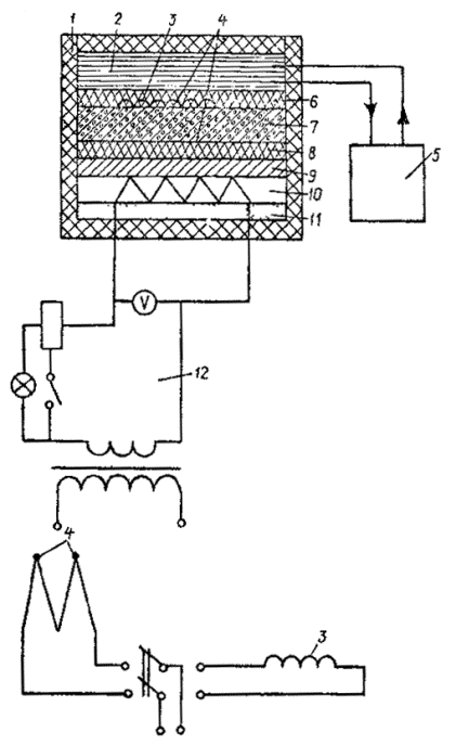 Рис. 1. Электрическая принципиальная схема измерительной системы: 1 - теплоизоляционная камера; 2 - холодильник; 3 - тепломер; 4 - термопара; 5 - термостат; 6-8 - резина; 7 - образец; 9 - дюралюминий; 10 - нагреватель; 11 - асбест; 12 - регулируемый электронагреватель 2.2. Одномерность потока, проходящего через испытываемый образец, обеспечивается теплоизоляционным кожухом камеры. 2.3. Температурный градиент по всей толщине образца достигается нагревом одной его поверхности нагревателем и отводом тепла с другой его поверхности холодильником. 2.4. Для более плотного прилегания испытываемого образца к демпфирующей плите нагревателя последняя оклеена термостойкой листовой резиной толщиной 2 мм. 2.5. Холодильник выполнен в виде емкости прямоугольного сечения размерами 250´250´30 мм с двумя штуцерами в ее боковой стороне. 2.6. Для более плотного прилегания холодильника к образцу на его рабочую поверхность нанесен слой герметика по ТУ 842-71 толщиной 5 мм со встроенными в него тепломеров в медь константановой термопарой.