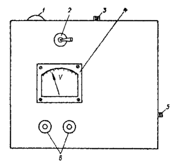 Рис. 2. Общий вид панели управления теплоизоляционной камерой: 1 - сигнальная лампа; 2 - коммутационный тумблер; 3 - тумблер питания; 4 - вольтметр; 5 - ручка ползуна реостата; 6 - клеммы 2.7. На панели управления теплоизоляционной камерой (рис. 2) расположены: сигнальная лампа, регистрирующая включение и выключение системы; коммутационный тумблер, переключающий на выходные клеммы тепломер и дифференциальную термопару; тумблер питания; вольтметр, регистрирующий величину напряжения нагревателя; ручка ползуна реостата, регулирующего напряжение нагревателя; выводные клеммы для подключения прибора, регистрирующего ЭДС термопары и тепломера. 3. ПОДГОТОВКА К ИСПЫТАНИЮ3.1. Для проведения испытания отбираются образцы в виде пластин размерами 250´250´50 мм ±10 %. 3.2. Образцу в количестве не менее трех должны пройти весь технологический цикл термообработки изделия. 3.3. Образцы должны иметь ровную поверхность без видимых дефектов ячеистой структуры и механической обработки. 3.4. При испытании образцов, подверженных уплотнению, деформации или усадке (например, минеральная вата и изделия на её основе, войлок, а также сыпучие материалы и т.п.), их следует закладывать в рамку из плотного теплоизоляционного материала (например, из жесткого пенополиуретана или ФРП-1), обеспечивающего заданные размеры. 3.5. Самопишущие мосты устанавливаются и подготавливается к работе с учетом требований, изложенных в «Инструкции по эксплуатации на мосты» 3.9026.171 ТО. 3.6. Поверка моста и выполнение измерений также осуществляются в соответствии с «Инструкцией по эксплуатации на мосты» 3.9026.171 ТО. 3.7. Поверка медь-константановых термопар должна осуществляться в соответствии с инструкцией № 163-54 Госстандарта СССР. 3.8. В течение первых двух лет с момента внедрения измерительной системы устанавливается интервал поверки в 6 месяцев. По истечении двухлетнего периода эксплуатации производятся наработки на отказ и уточнение межповерочного интервала. 4. ТАРИРОВКА ИЗМЕРИТЕЛЬНОЙ СИСТЕМЫ4.1. В соответствии с межповерочным интервалом необходимо определять коэффициент тепломера (измерительной системы), вмонтированного в слой тиоколового герметика на рабочей поверхности холодильника. 4.2. Определение коэффициента тепломера в измерительной системе должно проводиться посредством установки между нагревателем и холодильником образцового элемента из материала с известным коэффициентом теплопроводности. 4.3. Коэффициент тепломера в измерительной системе (для определенной средней температуры в образцовом элементе вычисляется по формуле: