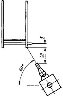В случае отсутствия устойчивого горения образца необходимо изменить положение горелки: установить горелку под углом 60° к горизонтали и расположить ее в соответствии с рисунком 4 таким образом, чтобы пламя касалось нижней кромки образца. Время воздействия пламени на новый образец - 5с.