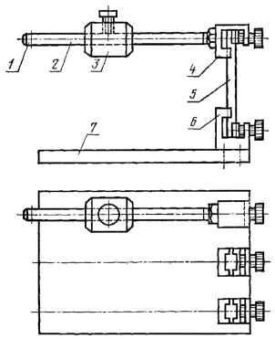 1 - ось указателя деформации; 2 - рычаг; 3 - перемещаемый груз; 4 - верхняя зажимная головка; 5 - образец; 6 - нижняя зажимная головка. Черт. 12.1.1. Зажимно-нагрузочное устройство должно обеспечивать закрепление и нагружение образцов (черт. 1). Схематическое изображение зажимных устройств, установленных на опорной плите для трех образцов, приведено на черт. 2. Зажимное устройство