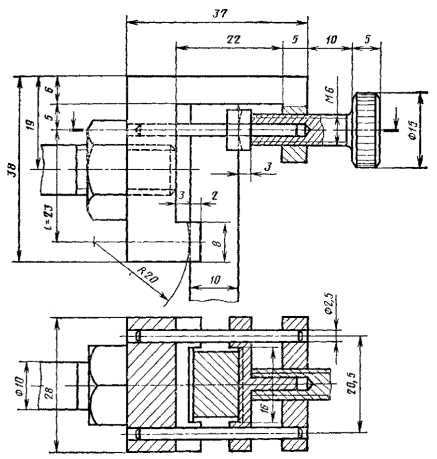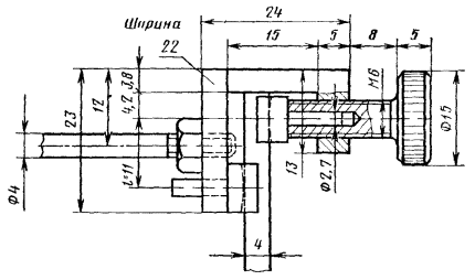 Черт. 5 Сменный упор для образцов 3 для зажимной головки Черт. 6 Значения масс перемещаемых грузов и номера чертежей зажимных головок и упоров для испытания образцов разных размеров должны соответствовать указанным в табл. 2. Таблица 2