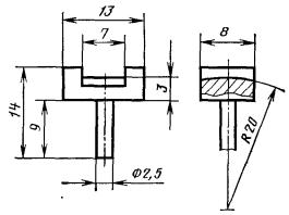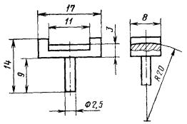 1 - ось указателя деформации; 2 - рычаг; 3 - перемещаемый груз; 4 - верхняя зажимная головка; 5 - образец; 6 - нижняя зажимная головка; 7 - опорная плита. Черт. 2 Каждый образец закрепляют в вертикальном положении в нижней и верхней головках с упорами, с верхней головкой соединен рычаг с перемещаемым грузом. Груз на рычаге устанавливают так, чтобы изгибающее напряжение ось равнялось 5 ± 0,5 МПа. Вид зажимных головок и упоров для испытания образцов различных размеров приведен на черт. 3-6. Зажимные головки и упоры должны быть изготовлены из стали. Верхняя зажимная головка для образца 1 Черт 3 Верхняя зажимная головка для образцов 2 и 3 Черт. 4 Сменный упор для образца 2 для зажимной головки
