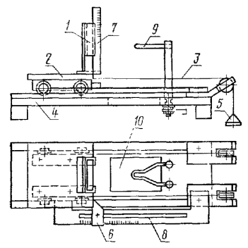 1 - зажим для закрепления образца; 2 – тележка; 3 - шнур, 4 – плита; 5 – груз; 6 – тормоз; 7 - шкала для измерения высоты пламени; 8 - шкала для измерения глубины проникновения петли в образец; 9 – проволока; 10 - отверстие для обеспечения выпадения раскаленных частиц Для нагревания конца проволоки до 960°С используют ток силой 120-150 А. Устройство для испытания (черт. 2) должно иметь такую конструкцию, чтобы нагретая проволока находилась в горизонтальной плоскости и сила поджатия ее к образцу составляла 0,8-1,2 Н. Сила поджатия в ходе проведения испытания должна оставаться постоянной в течение времени проникновения петли в образец на глубину не менее 7 мм. Для оценки возможности распространения загорания, например, путем отделения от образца горящих или раскаленных частиц, элементы, расположенные в обычных условиях эксплуатации вокруг образца, размещают под ним на расстоянии, эквивалентном расстоянию между ними в условиях эксплуатации. Если составные части электрооборудования испытывают отдельно, то на расстоянии (200 ±5) мм (если не оговорены другие условия) ниже зоны воздействия проволочной петли размещают плиту из белой сосны толщиной 10 мм, покрытую слоем папиросной бумаги. Примечание. Плотность бумаги должна составлять 12-30 г/м2. 5. ПАРАМЕТРЫ ИСПЫТАНИЯТемпературу проволочной петли выбирают из ряда: (550±10), (650±10), (750±10), (850±15), (960±15)°С Продолжительность приложения петли равна а=(30±1) с, если не оговорены другие условия. 6. ТАРИРОВКА ТЕРМОПАРЫТарировка термопары должна осуществляться при температуре 960°С с использованием в качестве стандартного метода фольги из 99,8%-ного чистого серебра в форме квадрата со стороной 2 мм и толщиной 0,06 мм. Фольгу размещают на поверхности проволоки, которая достигает температуры 960°С при плавлении серебряной фольги. Примечание. Тарировку повторяют, чтобы компенсировать изменения в термопаре и ее соединениях. Необходимо, чтобы термопара могла следовать за перемещением конца петли, вызванного его удлинением в результате нагрева. 7. КОНДИЦИОНИРОВАНИЕ ОБРАЗЦОВ ПЕРЕД ИСПЫТАНИЕМЕсли не оговорено специально, то образец выдерживают перед испытанием в течение 24 ч при температуре 15-35°С и относительной влажности 45-75%. 8. ПРЕДВАРИТЕЛЬНЫЕ ИЗМЕРЕНИЯПеред началом испытания образец осматривают и при необходимости измеряют его физические и электрические параметры. 9. ПОРЯДОК ПРОВЕДЕНИЯ ИСПЫТАНИЯПри проведении испытания необходимо обеспечить безопасность персонала от: опасности взрыва или пожара; отравления дымом и/или токсичными продуктами; воздействия ядовитых веществ. 9.1. Для испытания образец располагают так, чтобы: поверхность, находящаяся в контакте с концом проволочной петли, располагалась вертикально; конец петли находился в контакте с той частью образца, которая в обычных условиях подвергается воздействию тепловых нагрузок. Если такие части точно не определены, конец проволочной петли прикладывают к части образца с наименьшим сечением на расстоянии не менее 15 мм от верхнего края образца. Конец петли прикладывают к плоским поверхностям, не имеющим выбоин, прорезей или острых кромок. Средства для закрепления образца при испытании не должны вызывать значительных тепловых потерь. 9.2. Проволока нагревается током установленной величины до определенной температуры. Температура и ток должны оставаться постоянными 