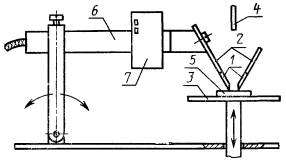Черт. 2 Электроды должны быть установлены симметрично в вертикальной плоскости, угол между ними равен 60°, поверхности срезов электродов должны быть вертикальными и удалены друг от друга по плоской горизонтальной поверхности образца на (4,0 ± 0,1) мм (черт. 2). Нажимное усилие каждого электрода на поверхность образца должно составлять (l ± 0,05) Н. Схема установки электродов с образцом показана на черт. 3. Примечание. Когда для моделирования условий работы вместо платины используют какой-либо другой металл, его указывают в протоколе испытаний. Полученные при этом результаты не следует обозначать СИТ и КИТ. 1 - платиновый электрод; 2 - медный удлинитель; 3 - опора; 4 - конец капельницы; 5 - образец; 6 - изоляционная трубка; 7 - груз Черт. 3 (Измененная редакция. Изм. № 1). 5.2. Испытательная цепь К электродам следует прикладывать синусоидальное напряжение частотой 48-60 Гц, изменяющееся в пределах 100-600 В. Мощность источника питания должна быть не менее 0,5 кВА. Основная схема показана на черт. 4.