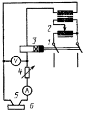 1 - выключатель; 2 - источник переменного тока на 100-600 В; 3 - защитное реле; 4 - переменный резистор; 5 - электроды; 6 - образец Черт. 4 Резистор с переменным сопротивлением должен позволять устанавливать ток между короткозамкнутыми электродами (1 ± 0,1) А, при этом напряжение на вольтметре не должно снижаться более чем на 10 %. Защитное реле в испытательной схеме будет срабатывать, когда ток в 0,5 А или больше будет протекать в течение 2 с. (Измененная редакция. Изм. № 1). 5.3. Капельница Поверхность между электродами смачивают каплями испытательного раствора через интервалы (30±5) с. Капли должны падать в середину промежутка между электродами с высоты 30-40 мм. Капли должны быть величиной (20 ± 3) мм3. Перед каждым испытанием иглу или другое приспособление для подачи капель очищают и выпускают достаточное количество капель, чтобы обеспечить правильную концентрацию испытательного раствора. Примечания: 1. Когда испытательный раствор остается на игле после испытания, испарение повышает концентрацию. Выпускание от 5 до 20 капель, в зависимости от промежутка времени между испытаниями, обычно позволяет удалить любую жидкость с повышенной концентрацией. 2. Для установления размера капель необходимо, чтобы в 1 см3 жидкости было не менее 44 и не более 50 капель. Размер капель периодически проверяют. 3. В качестве капельницы можно использовать иглу от шприца наружным диаметром 0,9-1,1 мм со срезанным под прямым углом концом. 4. В отдельных случаях отклонения от принятого интервала подачи капель на величину порядка ±5 с могут повлиять на результаты. Тогда должно быть установлено отклонение ±1 с (Измененная редакция. Изм. № 1). 5.4. Испытательный раствор Раствор А. (0,1 ± 0,002) % по массе хлорида аммония (NH4Cl) в дистиллированной или деионизированной воде. Удельное сопротивление при (23 ± 1)°С составляет (395 ± 5) Ом см. Раствор В. (0,1 ± 0,002) % по массе хлорида аммония и (0,5 ± 0,002) % по массе сульфонат-натрий-алкил-нафталена в дистиллированной или деионизированной воде. Удельное сопротивление при (23 ± 1)°С составляет (170 ± 5) Ом см. Раствор А является предпочтительным. В качестве более агрессивного загрязняющего вещества применяют раствор В. Для обозначения раствора В после величины СИТ и КИТ следует ставить букву «М» (например, СИТ 250М). Когда используют другие растворы, а не растворы А и В, это указывают в протоколе испытаний, причем результаты не обозначают СИТ и КИТ. Примечание. Образование токопроводящих перемычек ускоряется при снижении удельного сопротивления раствора и зависит от химической природы испытательного раствора. (Измененная редакция. Изм. № 1). 6. МЕТОДИКАИспытание проводят на образцах, защищенных от сквозняков, при окружающей температуре (23 ± 5)°С. Загрязнение электродов может повлиять на результаты испытаний, поэтому их следует очищать перед каждым испытанием. Испытуемые образцы устанавливают на металлической или стеклянной подставке таким образом, чтобы испытуемая поверхность была горизонтальной, а нажимное усилие скошенных концов обоих электродов на образец было равно нормированной величине. Расстояние между электродами проверяют, электроды должны иметь хороший контакт с образцом. Если края электродов подверглись эрозии, их следует восстановить. Напряжение берут подходящей величины, делимой на 25, и сопротивление регулируют таким образом, чтобы ток короткого замыка