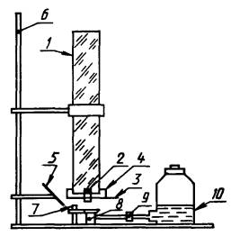 где Q - заданное поглощение защитного средства, кг/м3. 6.6 Пропитку образцов древесины осуществляют по способу вакуум - атмосферное давление в установке для пропитки (рисунок 1) с начальным вакуумом не менее 0,09 МПа, продолжительностью (15 ± 1) мин и продолжительностью выдержки в растворе защитного средства при атмосферном давлении (30 ± 1) мин. 6.7 Образцы древесины 1 (рисунок 1) помещают в пропиточный сосуд 2. Поверх образцов помещают сетку 3 и противовсплывное устройство (груз) 4. Пропиточный сосуд закрывают пробкой 5. Закрывают кран 6, открывают кран 7 и включают вакуумный насос 10. По достижении требуемого значения вакуума, контролируемого по вакуумметру 9, выдерживают образцы древесины под вакуумом в течение установленного времени, после чего открывают кран 6. В пропиточный сосуд засасывается под действием вакуума из сосуда 8 раствор испытуемого защитного средства. Отключают вакуумный насос, закрывают кран 7 и выдерживают образцы древесины в растворе при атмосферном давлении в течение установленного времени. По окончании пропитки образцы древесины вынимают из пропиточного сосуда, осушают их поверхность фильтровальной бумагой и сразу взвешивают с погрешностью не более 0,005 г. 6.8 Поглощение защитного средства Q1 в килограммах на кубический метр вычисляют по формуле