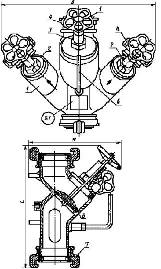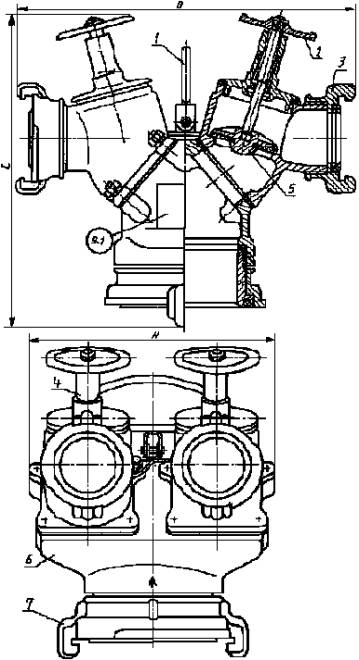 Пример условного обозначения трехходового разветвления типоразмера РТ-70: исполнения У: Разветвление РТ-70 У ГОСТ Р 50400-92 исполнения ХЛ: Разветвление РТ-70 ХЛ ГОСТ Р 50400-92 исполнения Т: Разветвление РТ-70 Т ГОСТ Р 50400-92 Трехходовое разветвление 1 - корпус, 2 - пepeкpывaющee устройство бокового выходного патрубка, 3 - перекрывающее устройство центрального выходного патрубка, 4 - соединительная головка на выходном патрубке, 5 - маховик, 6 - ручка, 7 - соединительная головка на входном патрубке, 8 - затворный клапан Черт. 1 Четырехходовое разветвление 1 - ручка, 2 - маховик, 3 - соединительная головка на выходном патрубке, 4 - перекрывающее устройство, 5 - затворный клапан, 6 - корпус, 7 - соединительная головка на входном патрубке Черт. 2 2. Технические требования2.1. Разветвления должны изготовляться в соответствии с требованиями настоящего стандарта, ГОСТ 12.2.037 по чертежам, утвержденным в установленном порядке. 2.2. Разветвления должны выдерживать гидравлическое давление: 1,8 + 0,1 МПа (18 + 1,0 кгс/см2) - для РТ-70 и РТ-80; 1,2 + 0,1 МПа (12 + 1,0 кгс/см2) - для РЧ-150. При этом не допускается появление следов воды (в виде капель) на наружных поверхностях деталей и течь в местах соединений. 2.3. Перекрывающие устройства и соединения разветвлений должны обеспечивать герметичность по 3-му классу ГОСТ 9544 при давлениях, превышающих приведенные в таблице на 0,005-0,1 МПа (0,5-1,0 кгс/см2). 2.4. Соединительные головки - по ГОСТ 28352. 2.5. Литые детали должны быть изготовлены из алюминиевого сплава марки АК7 (АК7) или АК7ч (АЛ9) по ГОСТ 1583 или из сплавов других марок с механическими и антикоррозионными свойствами, не уступающими указанным сплавам. 2.6. Поверхности литых деталей не должны иметь трещин, посторонних включений и других дефектов, влияющих на прочность и герметичность разветвлений и ухудшающих внешний вид. 2.7. На поверхностях литых деталей не допускаются раковины, длина которых превышает 3 мм и глубина 25 % толщины стенки детали. 2.8. Предельные отклонения размеров отливок деталей, мм: ±0,6 - для номинальных размеров до 60 мм включ. ±0,7 ” ” ” св. 60 до 100 мм включ. ±0,8 ” ” ” св. 100 до 160 мм ” ±0,9 ” ” ” св. 160 до 250 мм ” 2.9. Метрические резьбы должны выполняться по ГОСТ 24705 с полями допусков по ГОСТ 16093: 7Н - для внутренних резьб и 8g - для наружных резьб. Трубные цилиндрические резьбы - по ГОСТ 6357, класс В. Резьбы должны быть полного профиля, без вмятин, забоин, подрезов и сорванных ниток. Не допускаются местные срывы, выкрашивания и дробления резьбы общей длиной более 10% длины нарезки, при этом на одном витке - более 0,2 его длины. 2.10. Стальные детали разветвлений должны иметь покрытие Ц18.хр для исполнения У и Ц24хр. для исполнений ХЛ и Т; крепежные детали - покрытие Ц9.хр. Покрытия - в соответствии с требованиями ГОСТ 9.301. 2.11. Резиновые детали разветвлений климатических исполнений У и ХЛ должны изготовляться из резины с диапазоном рабочей температуры от 213 до 333 К (от минус 60 до плюс 60°С), а климатического исполнения Т - из резины групп II и III по ГОСТ 15152. 2.12. Затворные клапаны разветвлений должны перемещаться на полный ход с усилием на маховике не более: 441,0 Н (45 кгс) при наличии рабочего давления; 58,8 Н (6 кгс) при отсутствии рабочего давления. 2.13. Резьбовые части деталей перед сборкой должны быть смазаны солидолом по ГОСТ 4366. 2.14. Наружные поверхности деталей разветвлений исполнений У и Т, изготавливаемых по требованию заказчика, должны быть 