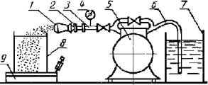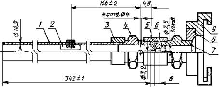 1 - корпус; 2 - пакет сеток; 3 - распылитель Черт. 2 Пожарный ствол для пены низкой кратности 1 - труба; 2 – успокоитель; 3 - муфта; 4, 7 – штуцер; 5 - распылитель; 6 - смеситель; 8 - переходник; 9 - головка напорная ГМ-50 Черт. 3 5.2.2. Подготовка к проведению испытаний В емкости 7 (черт. 1) приготавливают 100 дм3 рабочего раствора испытуемого пенообразователя. Всасывающий рукав опускают в приготовленный раствор и заполняют линию кратковременным включением насоса. Проверяют работоспособность установки. Определяют массу пустой емкости 8. Перед каждой серией определений осуществляют контроль температуры рабочего раствора пенообразователя (20 ± 2)°С. 5.2.3. Проведение испытаний Условия окружающей среды, при которой суммарная погрешность методики выполнения определений находится на уровне заданной следующие: температура воздуха от 15 до 25°С, давление от 84 до 106,7 кПа, относительная влажность воздуха от 40 до 80 %. Приготовленный рабочий раствор подают под давлением (0,6 ± 0,01) МПа ((6 ± 0,1) кгс/см2) в напорный рукав, на выхода которого установлен пенный пожарный ствол. После получения устойчивой струи из генератора пены средней кратности (ГПС) наполняют емкость для сбора пены и взвешивают ее. При этом должно быть равномерное заполнение всего объема, не допуская образования пустот. Массу пены определяют по разности веса заполненной и пустой емкости. Для низкократной пены емкость заполняют в течение 5-7 с. С помощью линейки с пределом измерения 100 см определяют высоту пены с погрешностью до 1 см и вычисляют объем низкократной пены (V) в кубических сантиметрах по формуле