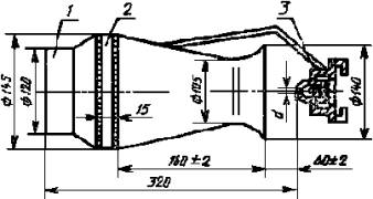 где Vп - объем пены, дм3; Vp - объем раствора пенообразователя, дм3, численно равный массе пены, кг. Для определения устойчивости пены средней кратности используют цилиндрическую емкость для сбора пены (h:d) = 1,5 вместимостью (200 ± 0,5) дм3, при этом значение кратности пены должно быть не менее 50. После равномерного заполнения из ГПС емкости пеной фиксируют время разрушения 50 % объема пены. 5.2.4. Обработка результатов За окончательный результат принимают среднее арифметическое двух определений. Допустимое расхождение между результатами повторных испытаний, полученных одним оператором при постоянных условиях испытаний с доверительной вероятностью 0,95, не должно превышать 10 %. 5.3. Определение времени тушения пеной низкой кратности из фторсодержащих пенообразователей водонерастворимых горючих жидкостейСущность метода заключается в определении времени тушения при заданной интенсивности подачи рабочего раствора пенообразователя. 5.3.1. Аппаратура, материалы Круглый противень, изготовленный из стали марки СтЗ, внутренним диаметром (1900 ± 15) мм, высотой (200 ± 10) мм, толщиной стенок 2,5 мм, площадью 2,8 м2. Пожарный ствол для пены низкой кратности с распылителем (черт. 3), позволяющим обеспечить расход раствора 10 дм3/мин при давлении на стволе (0,58 ± 0,02) МПа ((5,8 ± 0,2) кгс/см2). Тигель для повторного воспламенения, изготовленный из стали СтЗ, внутренним диаметром (300 ± 10) мм, высотой (100 ± 10) мм, толщиной стенок 2,5 мм. Тигель имеет ручку, на которой с помощью шеста он подается в противень. Секундомер с пределом измерений 60 мин и ценой деления 0,2 с. Горючая жидкость - н-гептан по ГОСТ 25828 или бензин по ГОСТ 2084 марки А-76. Вода питьевая по ГОСТ 2874 или по нормативно-технической документации на пенообразователь. 5.3.2. Подготовка к проведению испытаний Устанавливают противень на ровной поверхности земли. Располагают ствол на таком расстоянии и с таким наклоном, чтобы пена попадала в центр очага под углом 45°. Испытания проводят на открытом воздухе при скорости ветра вблизи противня не более 3 м/с. Температура воздуха (15 ± 5)°С, температуры горючего и рабочего раствора (17,5 ± 2,5)°С. 5.3.3. Проведение испытания Заливают в противень (150 ± 5) дм3 горючего без водяной подушки. Зажигают его. Время предварительного горения (120 ± 5) с после воспламенения. Подача пены в течение (120 ± 2) с, даже если тушение наступило раньше этого времени. Проводят три опыта. При успешном тушении в первых двух опытах третий опыт не проводят. 5.3.4. Определение времени повторного воспламенения После прекращения подачи пены через 60 с в центре противня устанавливают тигель для повторного воспламенения, в который залито 5 дм3 горючего. Горючее в тигле зажигают одновременно с зажиганием горючего в противне. При опускании тигля в противень необходимо следить, чтобы пена из противня не потушила горючее в тигле. Фиксируют время, за которое вся площадь противня будет охвачена пламенем. Время повторного воспламенения должно быть не менее 300 с. 5.3.5. Обработка результатов За результат испытания принимают среднее арифметическое результатов трех определений. Допустимое расхождение между результатами повторных испытаний, полученных одним оператором при постоянных условиях испытаний с доверительной вероятностью 0,95, должно быть в пределах ±20 %. 5.4. Определение времени тушения и критической интенсивности подачи рабочего раствор