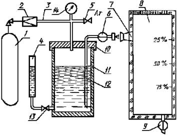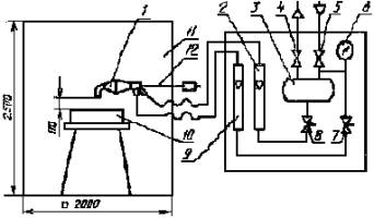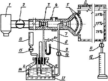 1 - пеногенератор; 2, 9 - ротаметр; 3 - бачок; 4, 5, 7, 8 - клапан; 6 - манометр; 10 - горелка; 11 - ограждение; 12 - выдвижной держатель Черт. 4 пеногенератор, обеспечивающий получение пены средней кратности (100 ± 20) при рабочих расходах раствора (2,0 ± 0,2) г/с и воздуха (200 ± 20) cм3/с; бачок, изготовленный из стали 12Х18Н9Т по ГОСТ 5632, вместимостью до 5 дм3 с горловиной и завинчивающейся крышкой, нижним сливным отверстием; ротаметр типа РМ 0,63 ГУЗ по ГОСТ 13045 с ценой деления 6,3Х10-3; ротаметр типа РМ 0,016 ЖУЗ по ГОСТ 13045 с ценой деления 1,6Х10-4; манометр по ГОСТ 2405 с верхним пределом измерения 0,6 МПа (6 кгс/см2) и ценой деления 0,04 МПа (0,4 кгс/см2); регулировочные клапаны; запорные клапаны; цилиндрические горелки, изготовленные из стали марки 12Х18Н9Т по ГОСТ 5632, внутренним диаметром от 140 до 450 мм, высотой (100 ± 2) мм, толщиной стенок 1-1,5 мм; ограждение для горелки и пеногенератора, которое оборудуют окном для наблюдения за ходом тушения, входной дверью для замены горелок и контроля пеногенератора, выдвижным держателем для пеногенератора; весы лабораторные типа ВЛК-500 по ГОСТ 24104; цилиндр 1-2000 по ГОСТ 1770с ценой деления 20 мл; секундомер с пределом измерений 60 мин и ценой деления 0,2 с; источник сжатого воздуха с рабочим давлением 0,3-0,4 МПа (3-4 кгс/см2); термометр по ГОСТ 28498 с диапазоном измерений от 0 до -100°С и ценой деления 0,2°С; н-гептан по ГОСТ 25828; вода дистиллированная по ГОСТ 6709 (или модель морской воды). 5.4.2. Подготовка к испытанию Готовят 4 дм3 рабочего раствора в дистиллированной (морской) воде с температурой (20 ± 2)°С. Раствор заливают в бачок. Подают воздух и раствор в пеногенератор. Через 5-10 с после начала подачи пены отбирают пробу в сосуд для определения расхода. Фиксируют время набора пены. Отбор пробы следует проводить таким образом, чтобы мерный сосуд был заполнен равномерно по всему объему. Определяют массу пены взвешиванием сосуда до набора пены и после. Расход раствора вычисляют делением массы пены на время заполнения сосуда, расход воздуха - делением объема пены на время заполнения сосуда. Если расходы соответствуют заданным, то приступают к проведению испытания. Условия окружающей среды, при которой суммарная погрешность методики выполнения определений находится на уровне заданной, следующие: температура воздуха от 15 до 25°С, давление от 84 до 106,7 кПа, относительная влажность воздуха от 40 до 80 %. 5.4.3. Проведение испытания После проверки работы пеногенератора заливают в горелку гептан высотой слоя (2,0 ± 0,1) см. Гептан зажигают и выдерживают время свободного горения (180 ± 5) с. Во время свободного горения пеногенератор должен находиться вне зоны пламени. Затем подают пену и вводят пеногенератор в зону горения, так, чтобы пена ложилась в центр горелки, поддерживая заданные расходы раствора и воздуха. Одновременно с вводом включают секундомер и измеряют время тушения, т.е. время от начала подачи пены в горелку до прекращения горения гептана. Проводят три опыта. При успешном тушении в первых двух опытах третий опыт не проводят. Для определения критической интенсивности подачи раствора пенообразователя размеры горелок подбирают таким образом, чтобы получить минимальный интервал между двумя значениями интенсивности подачи, при одном из которых время тушения составляет не более 300 с, а при другом оно превышает это значение, или тушение не наступает. Для каждой горелки проводят три опыта.