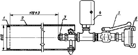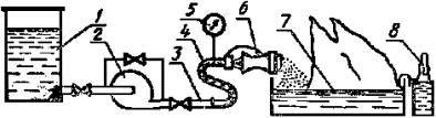 1 - емкость; 2 - насос; 3 - трубопровод; 4 - рукав; 5 - манометр; 6 – пеногенератор; 7 – противень; 8 - тигель Черт. 5 пожарный ствол для пены средней кратности с распылителем (черт. 6), обеспечивающим расход раствора от 3 до 4 дм3/мин при давлении на стволе от 0,4 до 0,6 МПа: Пожарный ствол для пены средней кратности