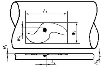 где 2.6. Для случая непосредственного измерения напряжений на участке трубопровода и в зоне дефекта в Приложении 1 приведена схема проведения измерений и последующего использования данных о напряжениях в расчетах. 3. СХЕМАТИЗАЦИЯ ДЕФЕКТОВ3.1. Исходными данными для схематизации дефектов являются результаты внутритрубной диагностики, непосредственных измерений или других неразрушающих способов контроля, получаемые по установленным методикам. 3.2. Поверхностный дефект в трубе с наружным диаметром Dн и толщиной стенки d представляется выемкой (рис. 3.1), глубиной Н, длиной L вдоль оси трубы и угловым размером Q в кольцевом направлении (ширина дефекта W равна QDн/2), под действием кольцевых (sqном, и продольных szном напряжений. Значения глубины Н, длины L, ширины W принимаются равными соответствующим наибольшим размерам дефекта. Рис. 3.1. Схематизация поверхностных дефектов 3.3. Дефект, представляющий собой явно выраженное одиночное глубокое повреждение («язва») на фоне общей коррозии - «совмещенный», заменяется двумя выемками (одна в другой) с размерами Н1, L1, W1 и H2,. L2, W2 (рис. 3.2). 3.3.1. Больший дефект с размерами Н1, L1, W1 рассматривается независимо. 3.3.2. Меньший дефект рассматривается как выемка с размерами H2,. L2, W2 в трубе с уменьшенной толщиной стенки d2: