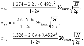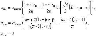 4.1.4. В общем случае коэффициенты концентрации напряжений и деформаций as, ae не равны asN, aeN , зависят от соотношений между размерами дефекта и трубы и соответствующим образом корректируются. 4.1.5. Для дефектов, имеющих в плане значительную площадь, в расчетах учитывается изменение размеров трубы и дефекта (увеличение диаметра, уменьшение толщины стенки), происходящее в процессе нагружения и ведущее к повышению фактически действующих в зоне дефекта напряжений. 4.2. Для поверхностных повреждений (рис. 3.1) расчет напряженно-деформированного состояния проводится по следующим уравнениям. 4.2.1. Условно-упругие компоненты напряжений рассчитываются в зависимости от размеров дефекта по формулам (Приложение 3): где