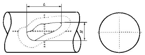 Рис. П1.1. Точки измерения напряжений в зоне дефекта П1.4.1. Общая коррозия - в местах минимальной (по возможности) и максимальной остаточной толщины стенки трубы. П1.4.2. Язвенная коррозия - в околодефектной зоне. П1.4.3. Стресс-коррозия - в центре колонии и вблизи трещины наибольшей длины. П1.4.4. Линейные дефекты - в околодефектной зоне в середине длины дефекта. П1.4.5. Дефекты металлургического характера, в том числе расслоения - над центром площади дефекта. П1.4.6. Дефекты сварных соединений - по усилению сварного шва и околошовной зоне. П1.4.7. Дефекты геометрии сечения трубы - по центру площади деформации и далее по линии образующей трубы, проходящей через центр, с шагом 100 мм до конца деформированной зоны. Аналогично, от центра по линии периметра трубы. Независимо от шага, измерения проводятся в обязательном порядке в местах экстремального изгиба стенки в ортогональных направлениях относительно оси трубы. П1.4.8. Кроме непосредственно дефектных зон, проводится измерение напряжений, если имеется доступ, по бездефектному металлу трубы в 4-х диаметрально противоположенных точках по периметру трубы. П1.5. Обработка результатов и представление данных в программы расчета. П1.5.1. Определяются наибольшие значения действующих напряжений в зоне дефекта в кольцевом sqд и продольном szд направлениях. П1.5.2. Определяются напряжения, действующие в бездефектной зоне в кольцевом sqб и продольном szб направлениях, и соответствующее давление pизм=2sqбd ¤ D. П1.5.3. Определяются упругие коэффициенты концентрации напряжений в кольцевом aqe = sqб ¤ sqд и продольном aze = szб ¤ szд направлениях. П1.5.4. С учетом разницы между рабочим давлением рраб, при котором происходит эксплуатация трубопровода, и давлением ризм, при котором проводятся измерения, вычисляются кольцевые sqном = sqб(рраб ¤ ризм) и продольные szном = szб(рраб ¤ ризм)) номинальные напряжения. П1.5.5. Определяются условно-упругие компоненты напряжений в зоне дефекта (см. также п. 4.2.1):
