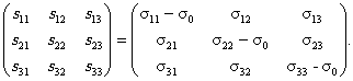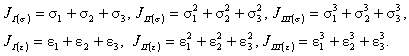 Наряду с инвариантами JI, JII, JIII или главными напряжениями (деформациями) могут быть введены и другие системы инвариантных величин, вполне определяющих соответствующий тензор и не зависящих от поворота осей координат. Инварианты одной системы могут быть выражены через инварианты другой. Тензор напряжений sij (равно как и любой симметричный тензор второго ранга) можно представить в виде суммы тензора гидростатического напряжения s0 и девиатора (отклонения от гидростатического состояния) sij: где