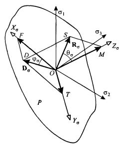 Рис. П2.1. Напряженное состояние в пространстве главных напряжений П2.2. Произвольному напряженному состоянию в пространстве главных напряжений соответствует точка S с координатами s1, s2, s3 (рис. П2.1) и вектор rs = OS. Проведем через начало координат ось Zs равнонаклоненную к каждой из осей s1, s2, s3 (гидростатическую ось) и плоскость Р перпендикулярную оси Zs - девиаторную плоскость. Введем в девиаторной плоскости Р оси Хs и Ys, причем ось Хs направим вдоль проекции оси s1 на девиаторную плоскость, а ось Ys перпендикулярно оси Хs так, чтобы Хs, Ys, Zs образовывали правую тройку. Вектор rs может быть представлен в виде суммы вектора ОМ, направленного вдоль гидростатической оси Zs, и вектора Ds = OD, лежащего в девиаторной плоскости Р. В свою очередь вектор Ds раскладывается на векторы OF и ОТ, направленные вдоль осей Хs и Ys соответственно. Проекции вектора Rs будут равны: