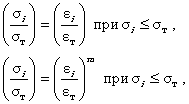 где m - упругий модуль сдвига. При si ³ sт связь между интенсивностью напряжений и интенсивностью деформаций для многих конструкционных материалов удовлетворительно описывается степенной функцией: где sт. - предел текучести, eт = sт ¤ 3m- интенсивность деформаций, соответствующая пределу текучести, m - коэффициент упрочнения. Для степенной диаграммы деформирования (П2.26) модуль сдвига mp равен: mp = m при si £ sт, (П2.27)
