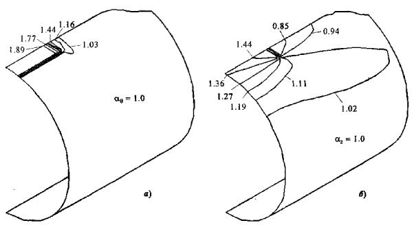 Рис. П3.2. Зависимости коэффициентов концентрации напряжений от размеров дефектов: а - кольцевые напряжения; б - продольные напряжения С достаточной точностью (погрешность не более 1 %) эти зависимости могут быть аппроксимированы формулами: